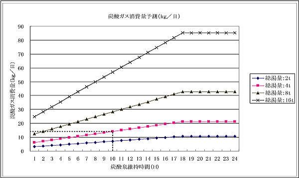 下のグラフから4トンの湯量で10時間濃度を保つ場合は、1日の炭酸ガス消費量が約14kgとなります。